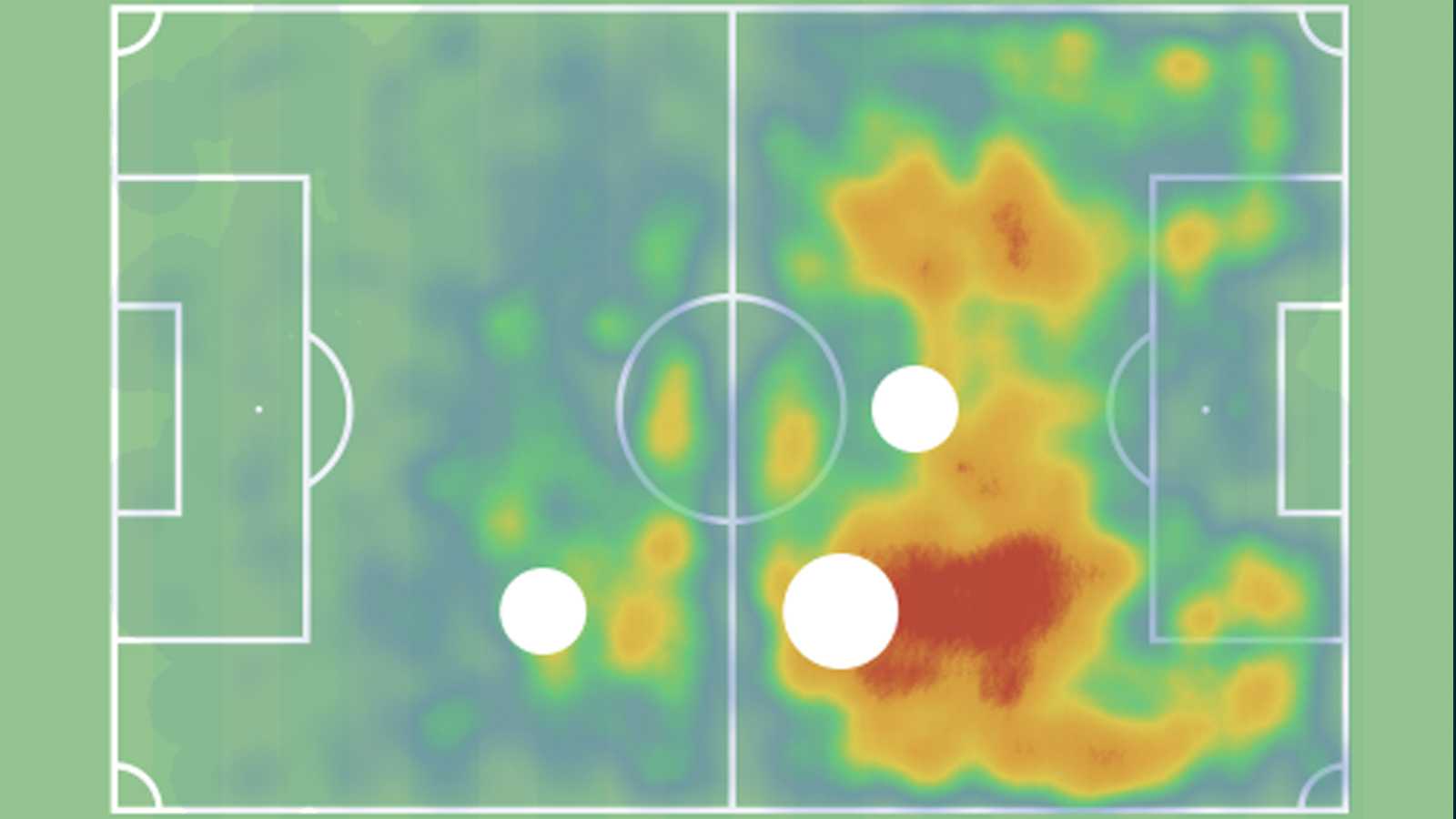 Bu ısı haritasının çok yoğun kırmızı alanlarına dikkat edin. De Bruyne’nin etkili olabilmesi için serbest dolaşıma ihtiyacı yok çünkü nitelikleri pozisyonu son derece iyi tamamlıyor.