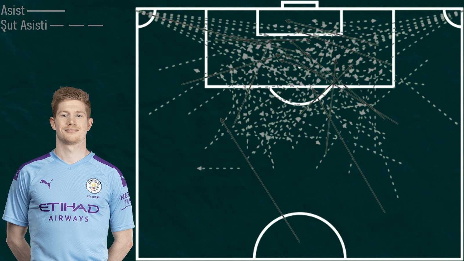 Okun başlangıcı, sahada nereden geçtiğini temsil ediyor. Çizgilere bakıldığında, asistlerinin veya şut asistlerinin çoğu sahanın üçte birlik kısmının dışından geliyor. De Bruyne’nin sahada derin bir pozisyondan nasıl yaratıcılık sağladığını gösteriyor.